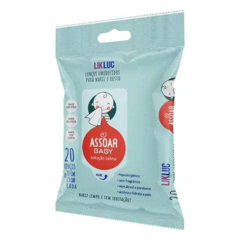 Os lencinhos umedecidos Assoar Baby possuem soro fisiológico e aloe vera em sua fórmula, auxiliando o descongestionamento nasal, prevenindo a irritação da pele e evitando o desconforto na hora de assoar.